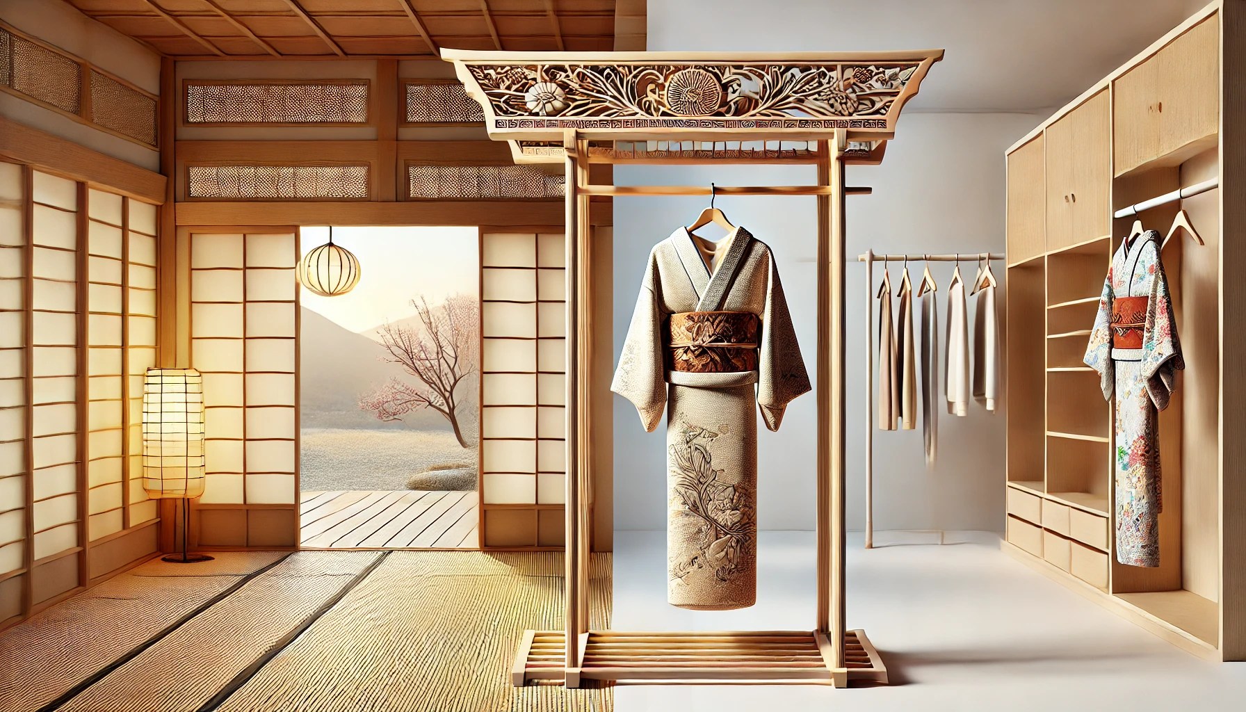 衣紐掛けの起源は、和装の時代にさかのぼります。その歴史は深く、日本独自の着物の保管方法として発展しました。特に平安時代において、衣紐掛けは宮廷文化の中で重要な役割を果たしていました。和室に設置されることが多く、自然素材を用いた装飾的なデザインが特徴でした。後世になると、一般家庭でも広く使用されるようになり、伝統的な家屋の中で一種のインテリアとしても機能していました。